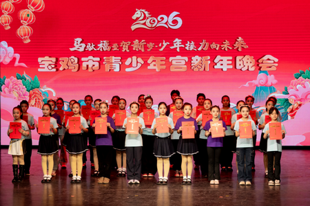 为落实立德树人根本任务,以美育为桥梁培育时代新人,让家国情怀在少年儿童心中生根发芽,2月4日,宝鸡市青少年宫举办"马驮福至贺新岁·少年接力向未来"2026年新年晚会。晚会以艺术为载体,将思想引领融入美育实践,在团市委、市文旅局、市文化艺术中心、市科技馆、市图书馆、宝烟社区等相关单位的关心指导和大力支持下,为观众献上了一场格调高雅、充满朝气的新年视听盛宴,展现了新时代少年儿童昂扬向上的精神风貌,激发了广大青少年爱党爱国热情,坚定了文化自信。