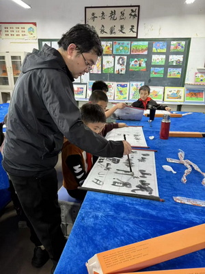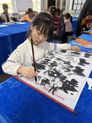 在舞蹈课上,孩子们仿佛被施了魔法,个个都有饱满的精气神。少儿舞蹈专业赵老师细心地梳理细化了剧目《太平女儿鼓》的第一舞段动作。每一个步伐、每一个手势,都蕴含着传统文化的魅力。孩子们跟着老师的节奏,认真地模仿着,从生疏到熟练,从拘谨到自信,他们的舞姿在教室里绽放,仿佛要把这古老的舞蹈传承下去,又赋予了它新的活力。 书 法 课 堂