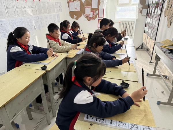书法课堂上,孩子们沉浸于欧楷的笔画世界。今天的教学内容包括“浮鹅钩”“戈钩”与“斜钩”这三种笔画的书写技法,以及它们如何在完整汉字中得到应用。书法专业王老师边讲解边示范,孩子们手持毛笔,小心翼翼地在水写布上描摹每一笔。随着练习的深入,他们不仅掌握了笔画的用笔技巧,更体会到汉字的结构之美与文化之深。