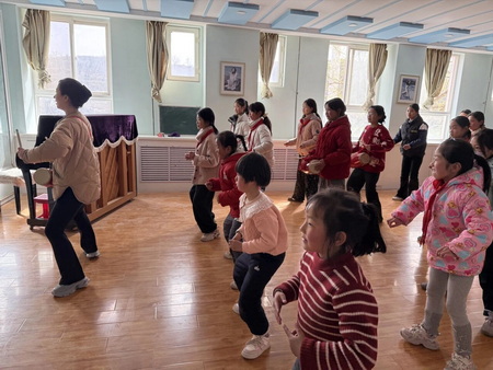 舞蹈教室里,鼓声阵阵,彩绸飞舞。本次课程细致学习了背鼓、打鼓、抱鼓的方法要领,孩子们从基础规范学起,扎实掌握每一个动作细节。课堂上,大家踏着碎步跑场的灵动步伐,红绸随节奏翻飞,鼓点愈发激昂。在不断练习中,孩子们渐渐找准节奏,展现出穿插队形的默契配合,动作整齐、气势昂扬。这不仅是一次舞蹈学习,更是对陕北非遗文化的传承与致敬。