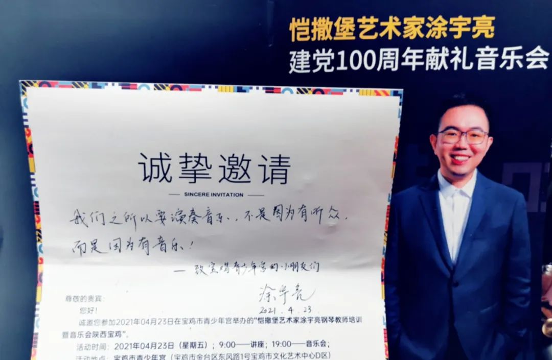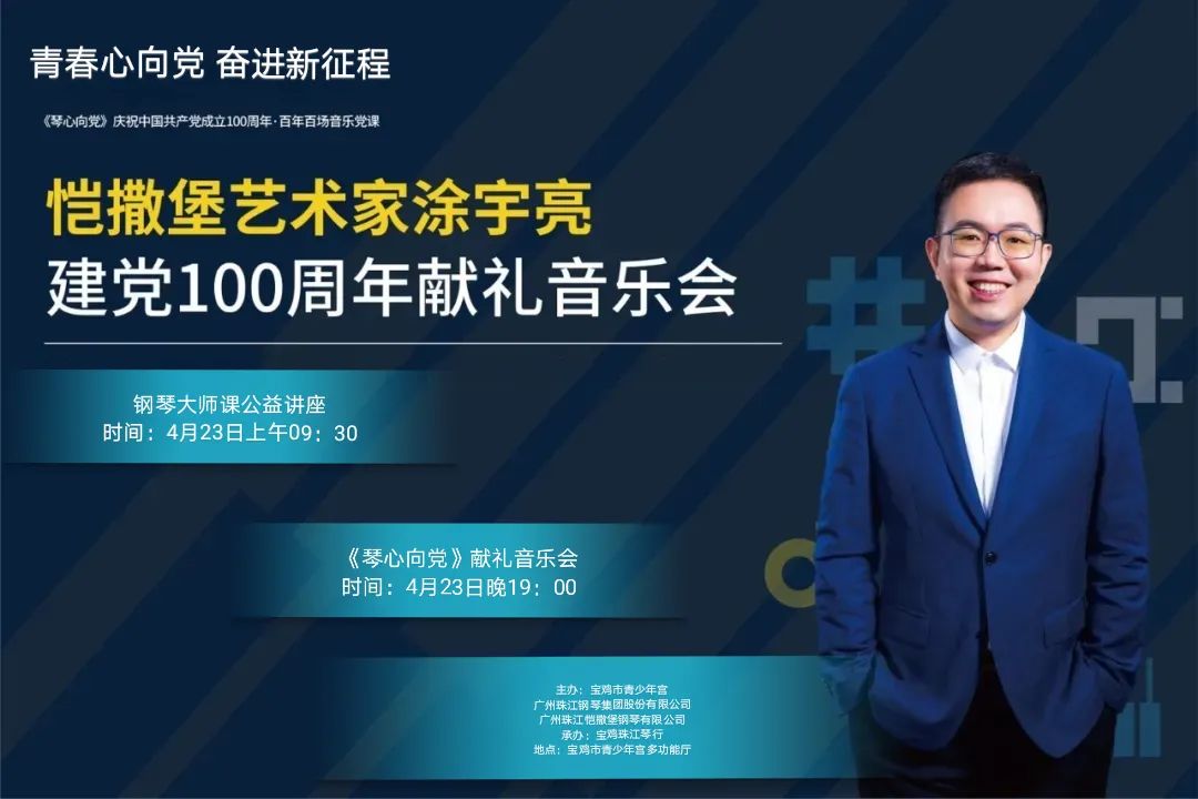为了隆重庆祝中国共产党成立100周年,展现中国共产党百年历程和丰功伟绩,教育引领广大青少年了解党的光辉历程、铭记革命历史民族精神、推动爱国主义教育。宝鸡市青少年宫特邀请星海音乐学院教师、恺撒堡艺术家涂宇亮先生举办 “青春心向党 奋进新征程”建党100周年献礼音乐会