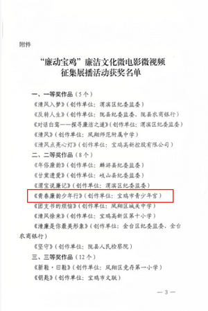 为深入贯彻中央、省、市纪委四次全会精神,落实《关于加强新时代廉洁文化建设的意见》,增强廉洁教育吸引力与感染力,今年 2 月起,市纪委监委在全市开展 “廉动宝鸡” 廉洁文化微电影微视频征集展播活动。活动开展以来,市青少年宫积极响应,紧扣 “崇廉尚洁” 主题,充分发挥美育特色进行创新创作。近日活动评选结果揭晓,宝鸡市青少年宫策划拍摄的廉洁文化主题 MV《青春廉韵少年行》,从 102 部参赛作品中脱颖而出,斩获二等奖!