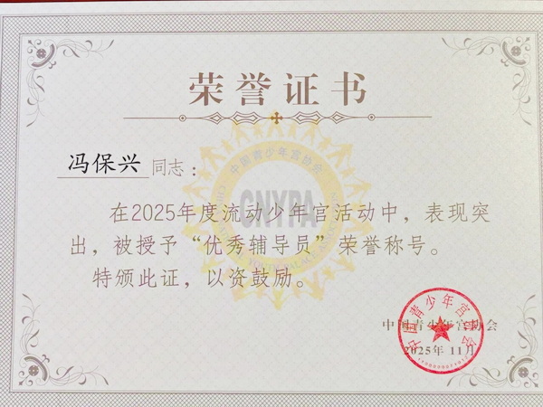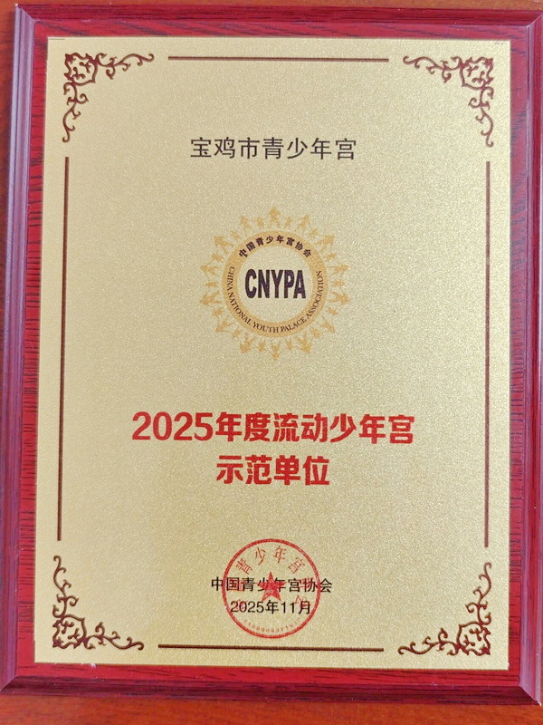 捷报传来 载誉前行 为深入贯彻习近平新时代中国特色社会主义思想,落实立德树人根本任务,宝鸡市青少年宫积极响应中国青少年宫协会《“流动少年宫”活动项目工作指引(试行)》,全年多次组织送教活动。近日,中国青少年宫协会经综合评估,授予全国22家单位“2025年度流动少年宫示范单位”,宝鸡市青少年宫光荣在列,连续三年获评中国宫协 “流动少年宫示范单位”!同时,市青少年宫教师冯保兴荣获“2025年度流动少年宫优秀辅导员”。