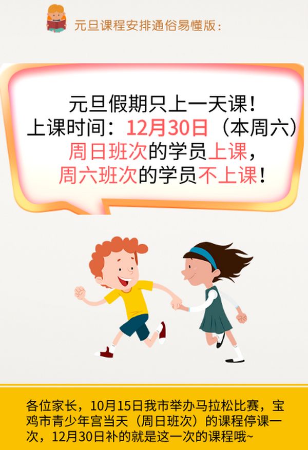 各位学生家长,根据单位教学工作安排,2024年宝鸡市青少年宫元旦课程安排如下: