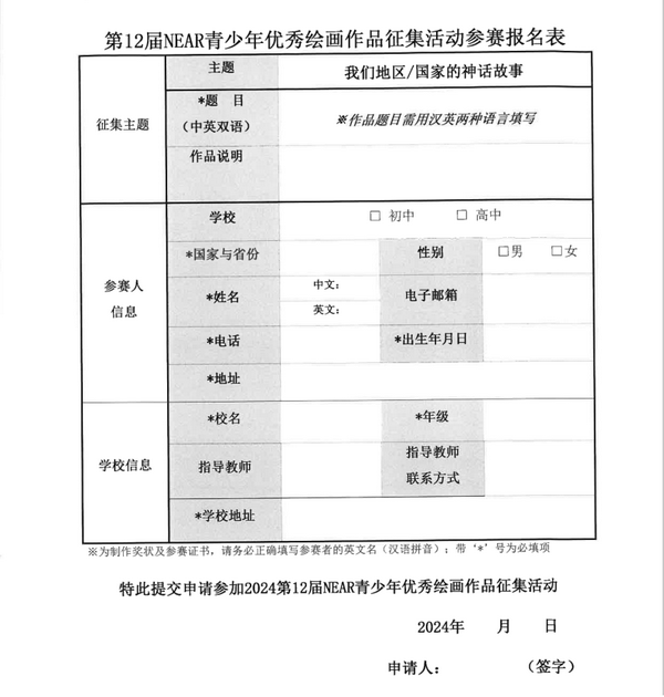 第12届NEAR青少年优秀绘画作品征集活动参赛报名表 下载链接:/images/file/202406/20240617224053_38898.docx
