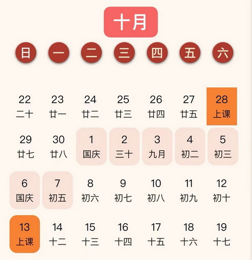 放 假 通 知 亲爱的学员和家长们: 金秋十月,丹桂飘香。国庆假期将至,根据《国务院办公厅关于2024年部分节假日安排的通知》,结合宝鸡市青少年宫秋季学期教学安排,现将国庆节放假时间及课程安排通知如下: 9月28日(周六)上课(周六班次上课), 9月29日(周日)不上课, 10月12日(周六)不上课, 10月13日(周日)上课(周日班次上课), 10月1日——10月7日不上课。