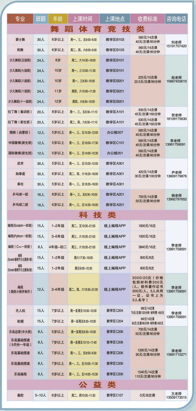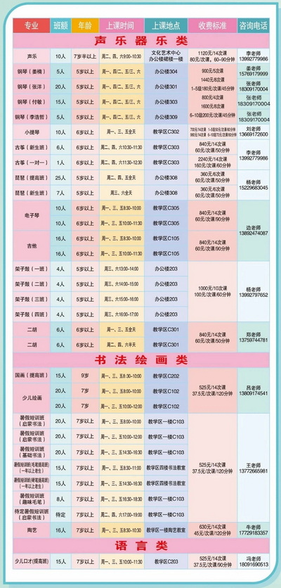 涵盖声乐器乐、书法绘画、舞蹈体育竞技、