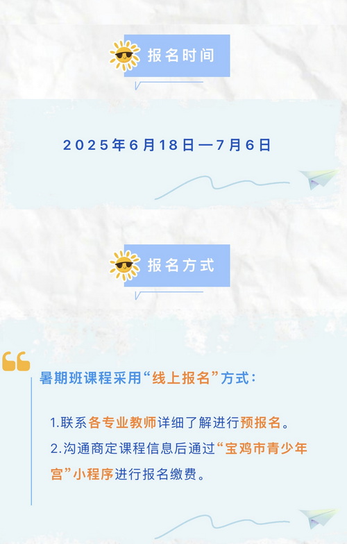 市青少年宫暑期班培训课程于2025年7月7日开课,8月7日结课。报名采取“线上报名”的方式,学员家长可咨询各专业教师抢先报名哦~