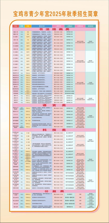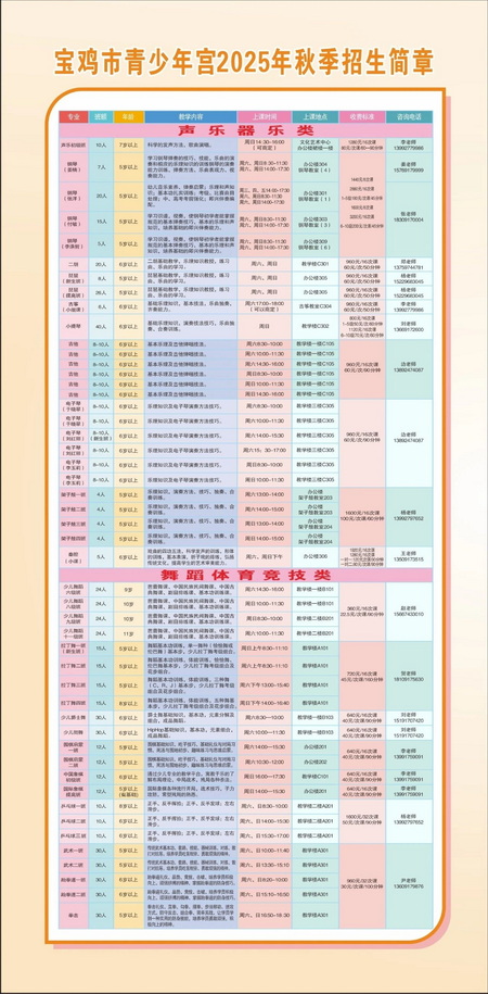 秋季课程报名采用“线上报名”方式: 1.联系各专业教师详细了解进行预报名。 2.沟通商定课程信息后通过“宝鸡市青少年宫”小程序进行报名缴费。 招 生 简 章