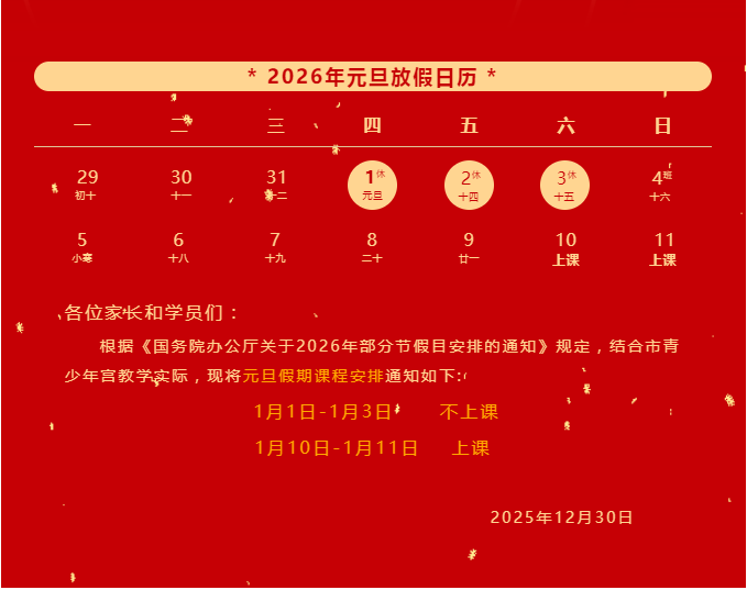 宝鸡市青少年宫2026年元旦放假及课程安排通知 |