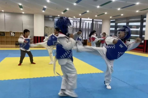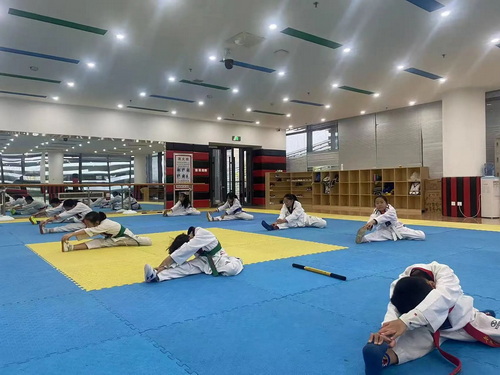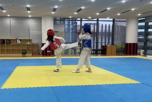 市青少年宫武术专业课堂上,学员们身着整洁的武术练功服,或扎马步,身姿沉稳如松,腿部肌肉紧绷,展现出坚韧不拔的毅力;或抡臂转腰,动作行云流水,每一次的伸展与扭转都仿佛在与空气对话,调动着身体内的每一丝力量。教练在学员之间穿梭巡视,不时轻声纠正动作,那专注的神情如同雕琢玉器的工匠,精心打磨着每一块璞石。在市青少年宫武术专业课堂,孩子们在这里感受中华武术的魅力与精髓,铸就钢铁般的意志和高尚的品德。 跆拳道课堂