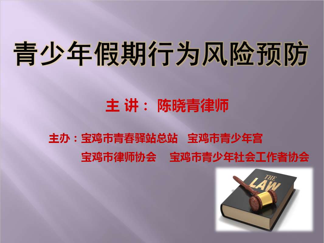 正值暑假期间,为了进一步增强青少年的行为风险防范意识,提升青少年自我保护能力。7月25日,宝鸡市青少年宫和宝鸡市青春驿站总站共同主办,邀请了宝鸡市律师协会未成年人保护委员会副主任陈晓青在宝鸡市青少年宫多功能厅开展了一场家庭教育公益讲座。