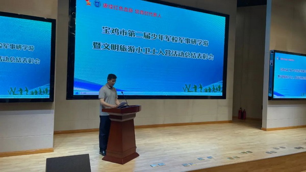 5月28日,宝鸡市第二届少年军校军事研学游暨文明旅游小卫士入营活动表彰会在宝鸡市青少年宫小剧场举行,表彰会回顾了“少年军校”军事研学游暨文明旅游小卫士夏令营的亮点并进行了总结,团市委领导为获奖单位和个人颁发了荣誉证书,宝鸡市青少年宫获得优秀单位荣誉证书。